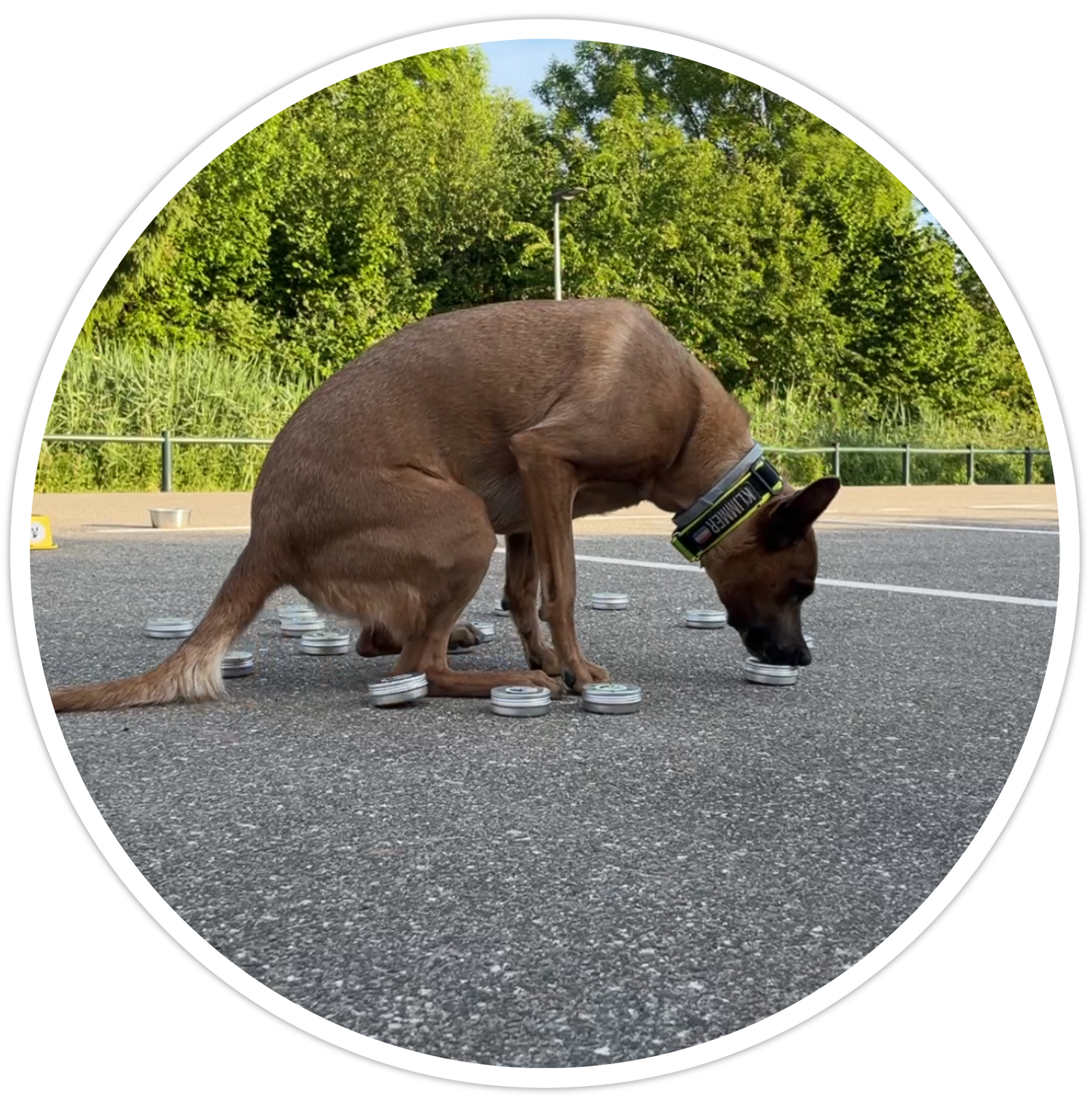Tijdens de introductiecursus detectie staat het aanleren van een passieve melding en het imprinten van een doelgeur centraal. Detectie is leuk en versterkt de band tussen de geleider en de hond.